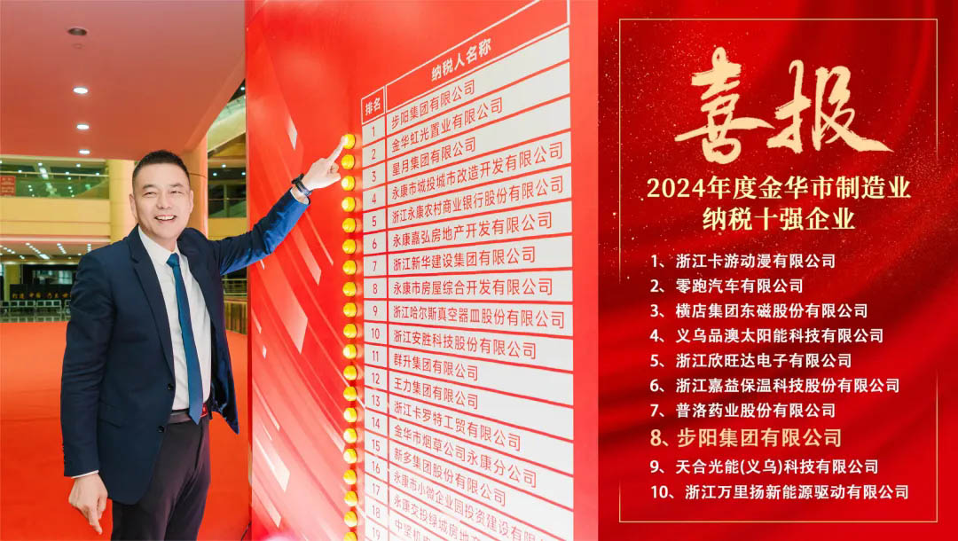 2月12日,永康市工業大會暨納稅雙百企業表彰大會隆重召開。此次大會旨在總結2024年永康市工業經濟發展成果,并對過去一年中表現突出的企業進行表彰。步陽集團有限公司憑借卓越的經營業績和對社會的杰出貢獻,連續六年蟬聯永康市納稅冠軍,并在金華市制造業納稅十強企業中位列第八名。